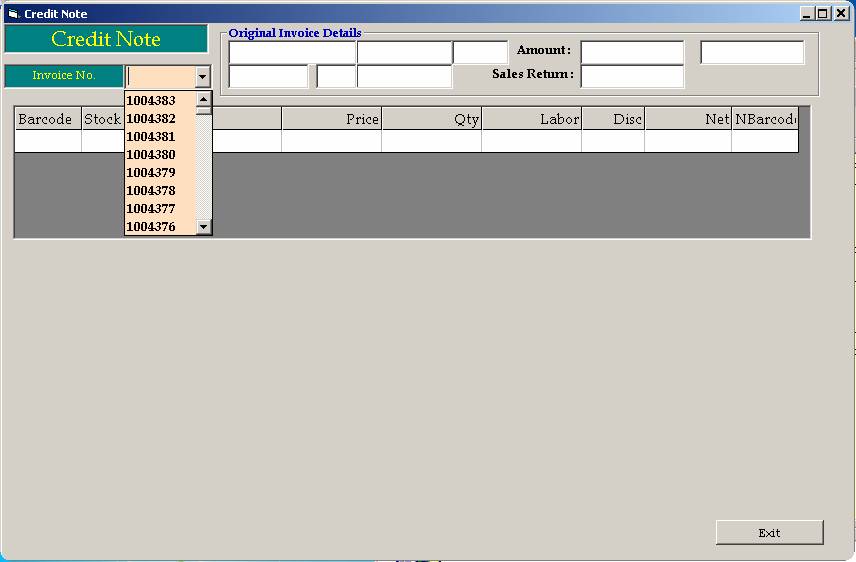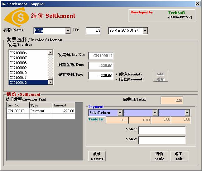 Default selection is ¡°SalesReturn¡±. Just click ¡°Settle¡± and follow by ¡°Exit¡± to return to Credit Note screen.
