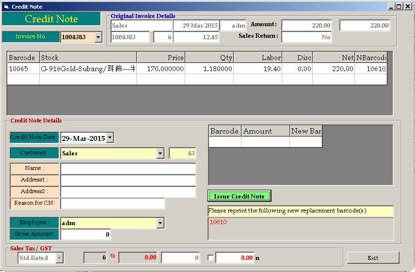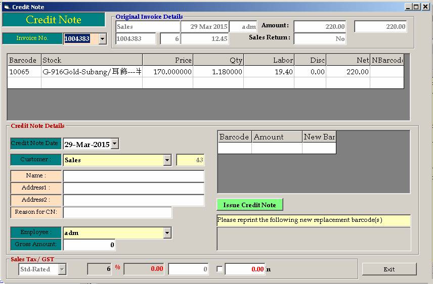 5. System will generate a credit note and generate a replacement barcode no. Please get an authorized person to reprint the new barcode label.