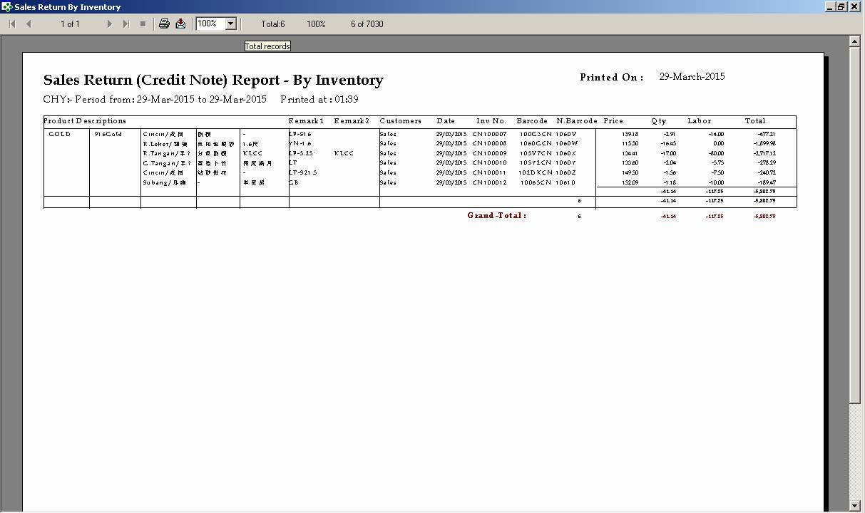 Sales Return report will be generated as shown below showing barcodes returned and new replacement barcodes generated. Supervisor or manager should reprint the barcode label accordinly.