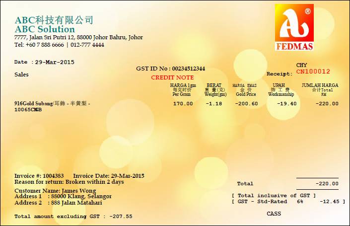 3.Enter the customer name, address and reason for the return. (As required by Custom regulation on Credit Note)